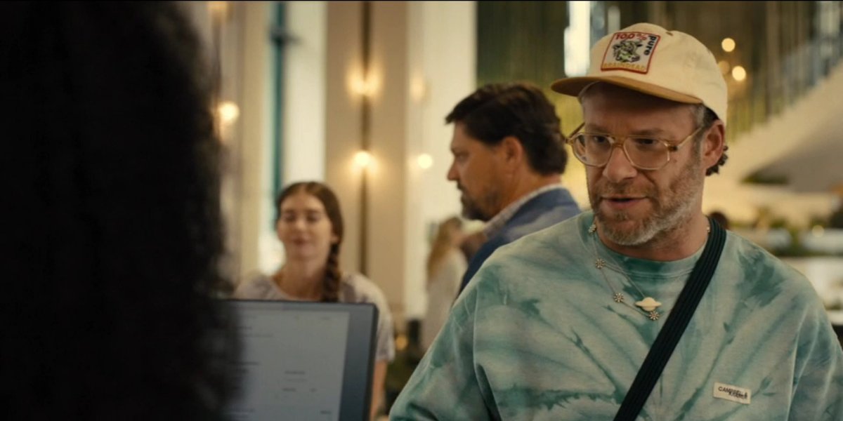 Platonic, Jeopardy scene with Seth Rogen (Will), Ashley Rideaux (Hotel Receptionist) and Mircea Oprea (Dad)