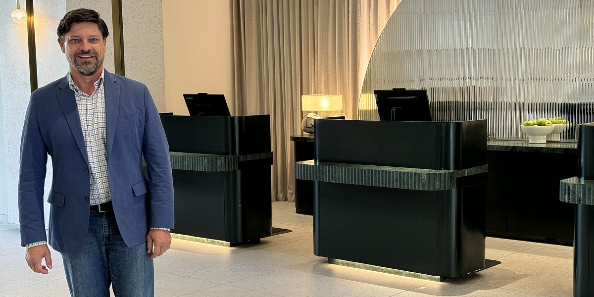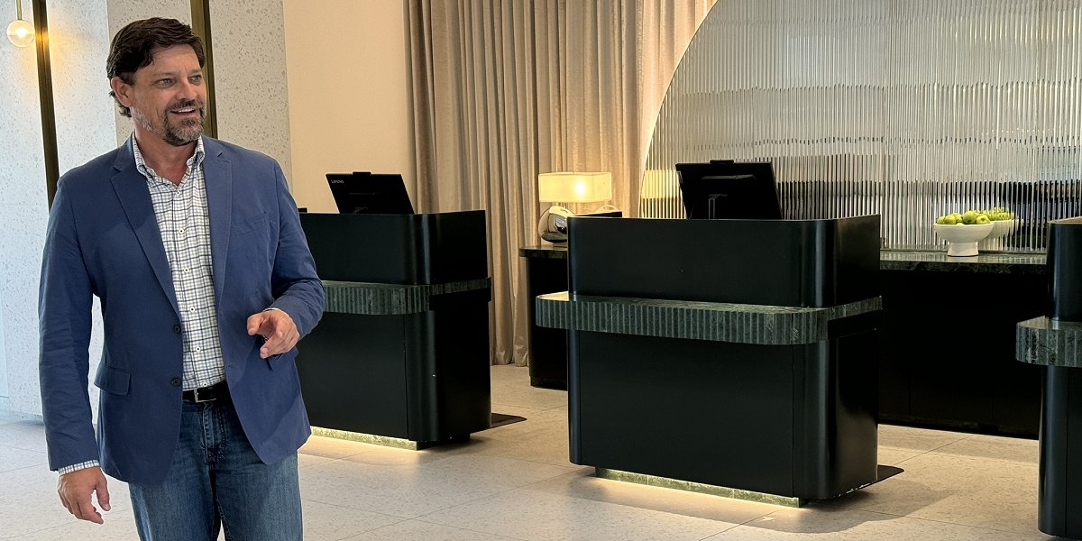 In this scene Mircea Oprea is playing a Dad checking into hotel with his family while the character Will (Seth Rogen) is told that his credit card was denied. Platonic - Jeopardy S2E5.